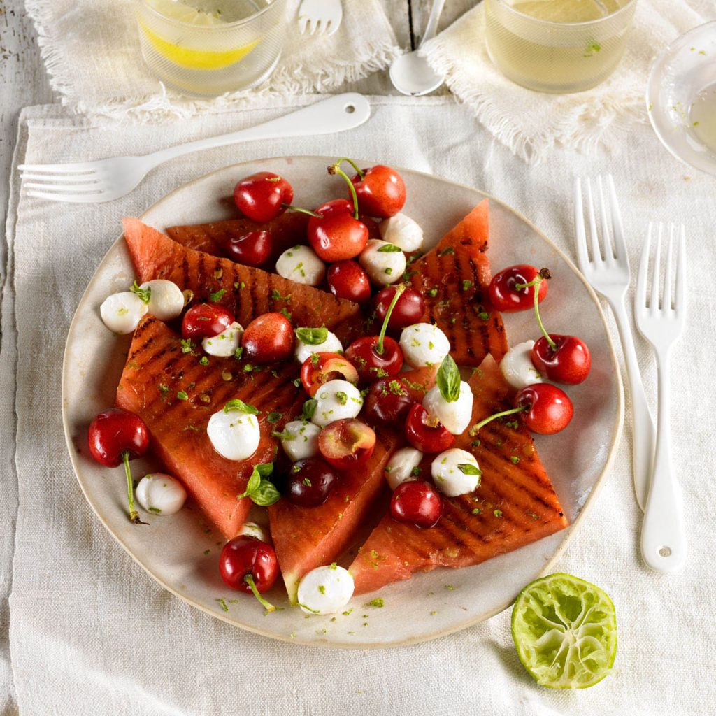 Síndria a la planxa amb cireres i mozzarella