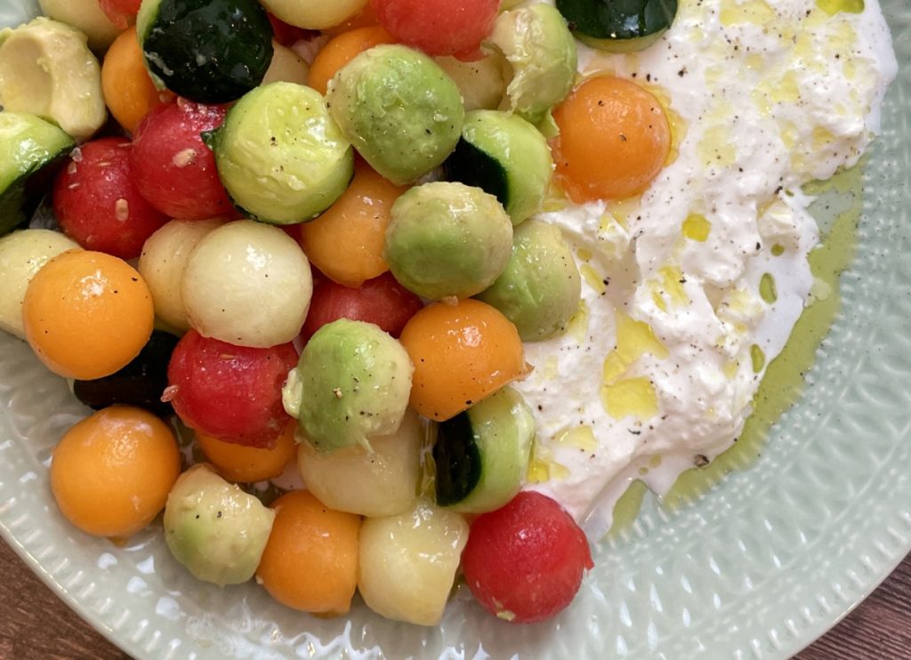 Amanida de burrata amb boles de fruita i verdura