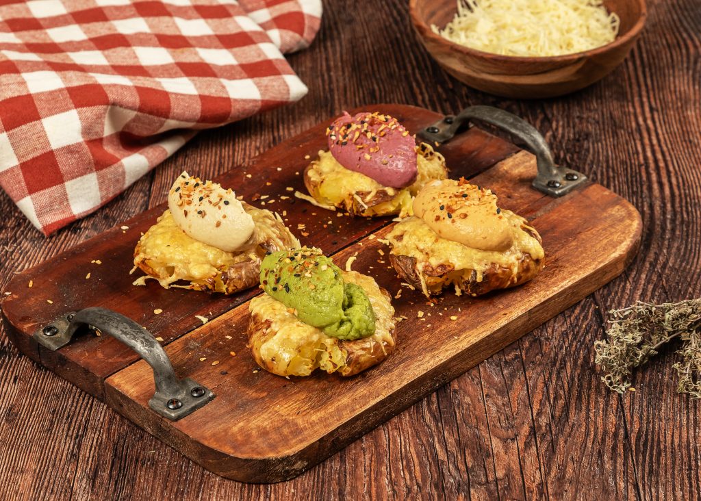 Patates cruixents amb hummus i guacamole