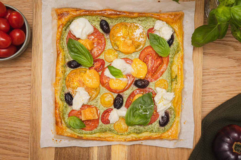 Coca de tomàquets variats, ricotta i pesto