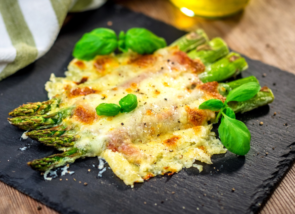 Espàrrecs verds gratinats amb pernil salat i emmental