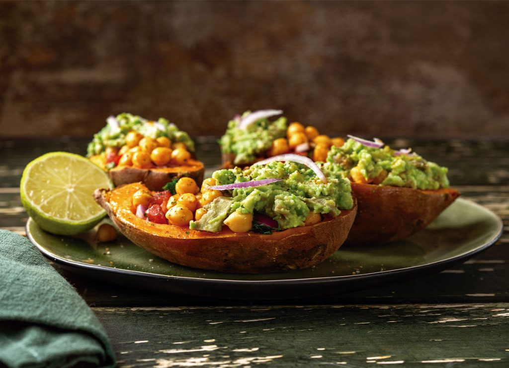 Moniato farcit amb llegums i alvocat amb formatge gratinat