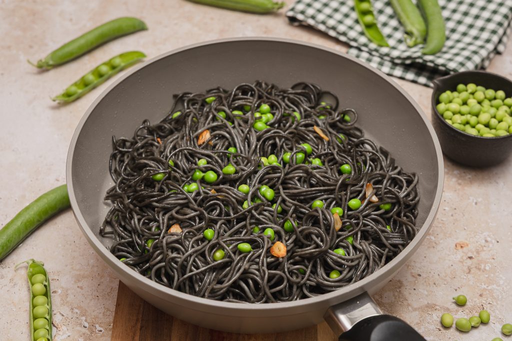 Espaguetis de sepia con guisantes