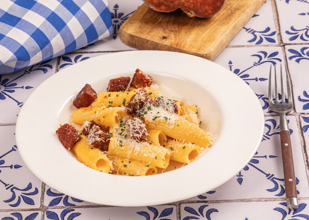 Pasta con carbonara de sobrasada