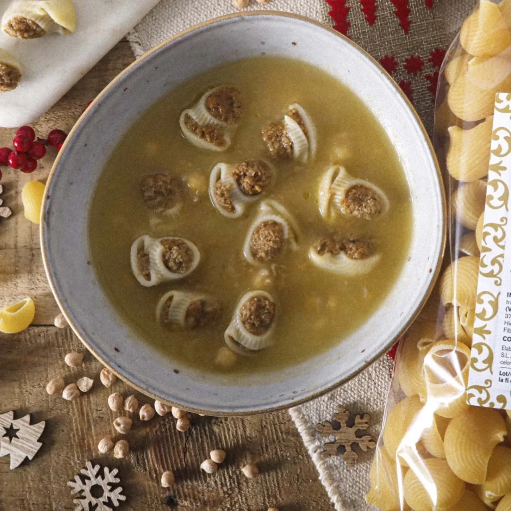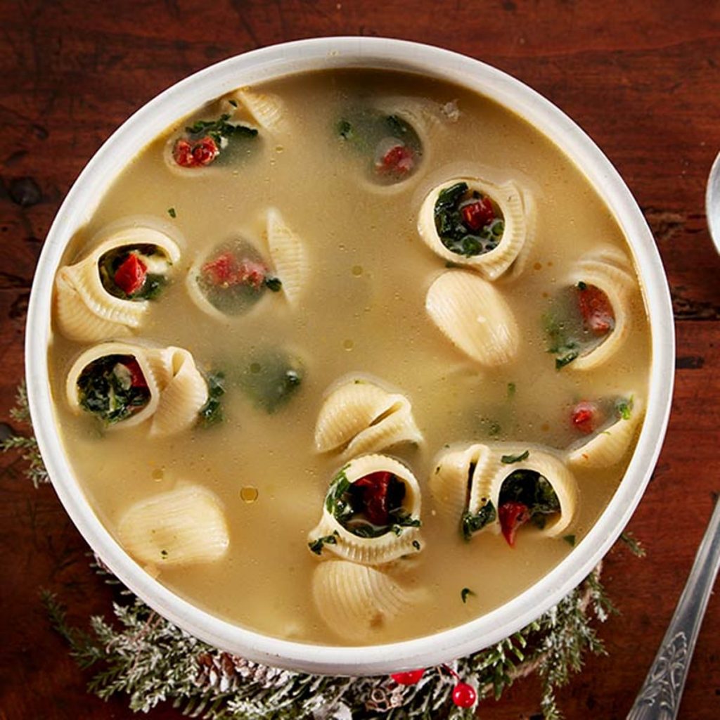 Sopa de galets rellenos de espinacas y ricotta