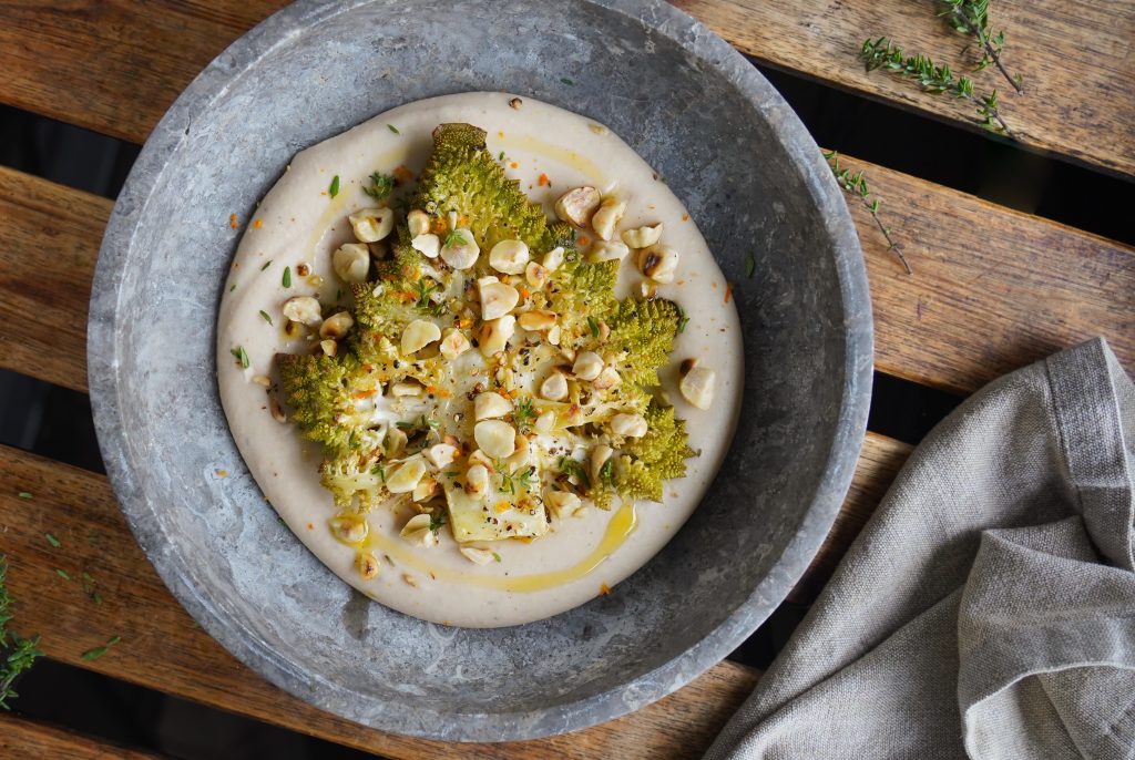 Chuletón de romanesco con crema de alubias blancas